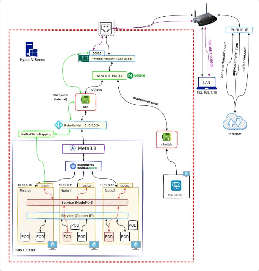 Như sơ đồ hệ thống ở trên thì mình cần 1 Reverse Proxy ở phía trước K8s Cluster để điều hướng request đến các service.
